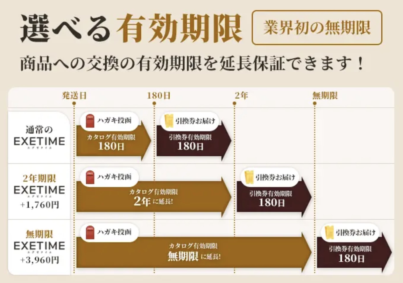 EXETIME(エグゼタイム) Silver以上のカタログであればハガキの投函期限を、+1,760円で2年に、+3,960円で無期限にすることができます。